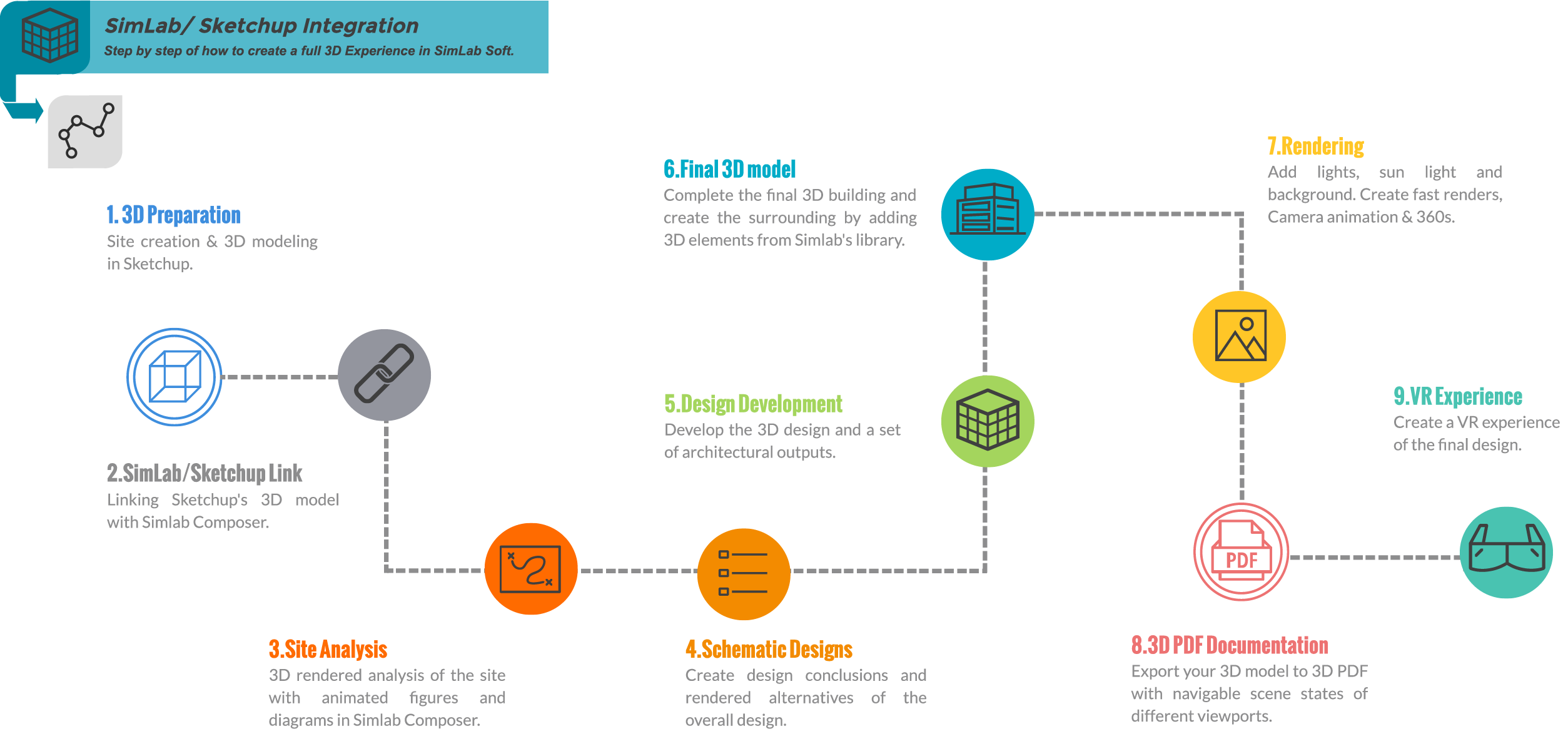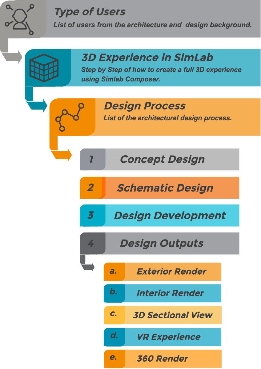 In this document, we will walk through the design process from the early concept stage till the final architectural design outputs. Simlab can be integrated with the first three steps of design while other are more into technical details.