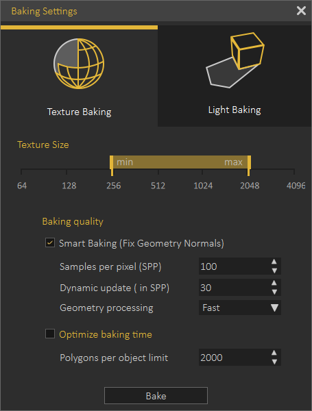 Control the baking (rendering) quality.